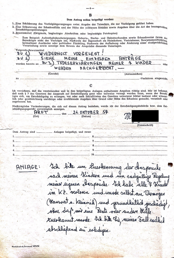 Antragsbogen aus der Wiedergutmachungsakte Johanna M.’s aus Arft, die als Sintezza gemeinsam mit ihren sieben Kindern verfolgt und in das Konzentrationslager Auschwitz deportiert wurde. (Landesamt für Finanzen – Amt für Wiedergutmachung Saarburg; VA162211). Die Tilgung des Nachnamens wurde durch die VerfasserInnen vorgenommen.
